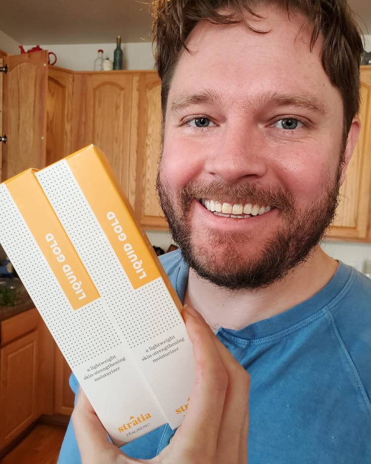 Editor’s Notes: This doesn’t actually have a fragrance like bananas, no matter how many times I tell him. The sea buckthorn oil, which gives this its incredible color, does have a bit of a natural scent. This is one of the only products he’s managed to empty without my help (well, mostly — it was mine first and I still occasionally steal a pump or two to buffer retinol). His love of this product managed to score us some free Stratia products one time — this quick photo of him made it onto the brand’s instagram.